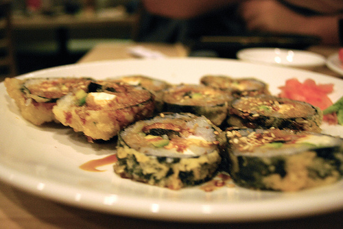 Maki sushi – słowo maki oznacza zawijać-rolować, czyli maki sushi to zwijane sushi. Najpopularniejsze to zawijane w nori, czyli ciemnozielone krasnorosty. Równie dobrze maki mogą być zawinięte w naleśnik lub rybę. Maki dzielimy na, hoso-maki, czyli cieńko rolowane oraz futo-maki grubo rolowane sushi.Rodzajów maków jest bardzo wiele. Ich nazwa zależy od tego, co jest w środku. Bardzo popularne są np. kalifornia maki z awokado, paluszkiem krabowym, majonezem, ogórkiem.
