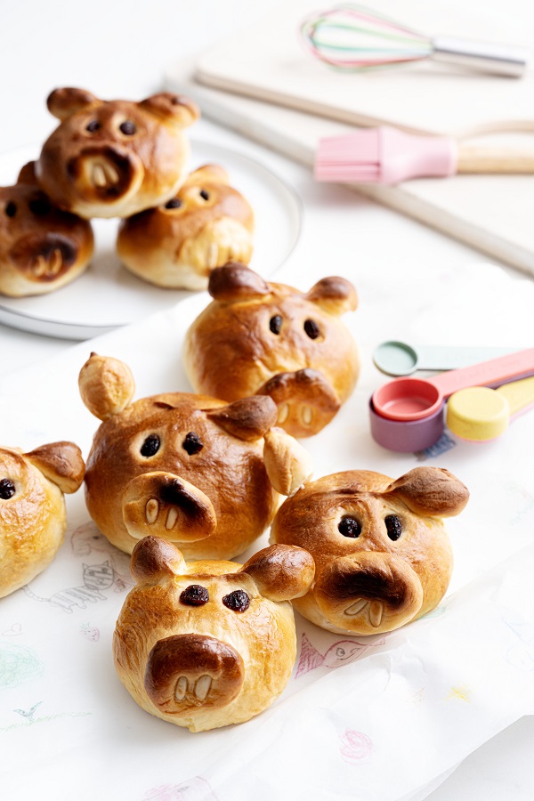 3. Ciasto przełożyć na oprószony mąką blat i podzielić na 9 równych części. 8 z nich uformować w okrągłe bułeczki, odstawić. Pozostały kawałek ciasta wykorzystać do przygotowania nosów i uszu prosiaczków. W tym celu należy podzielić go na 2 równe części. Z jednej połówki zrobić 8 mniejszych kulek, lekko je spłaszczyć i przykleić na przodzie odstawionych 8 bułeczek, tworząc pyszczki prosiaczków. Z drugiej połowy zrobić 16 równych kawałków. Uformować palcami lekko spiczasty kształt i przyklejać w górnej części bułeczki, tworząc uszy.